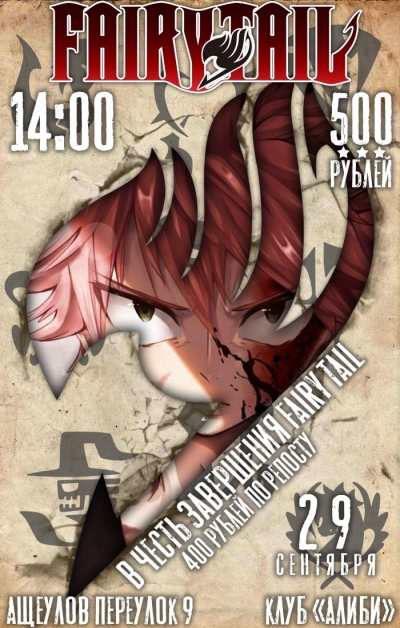 Аниме-мероприятие от команды "Анистар", посвящённое окончанию аниме "Фейри Тейл": конкурсы, просмотр заключительной серии "Фейри Тейла" с озвучкой ВЖИВУЮ от OVERLORDS'a, концерт Jackie-O, концерт Sati Akura (ВПЕРВЫЕ В МОСКВЕ!!!), крутые призы и офигенное настроение уже 29 сентября в 14:00, в клубе "Алиби" по адресу: М. Тургеневская, или М. Сретенский Бульвар, Ащеулов переулок д. 9.
