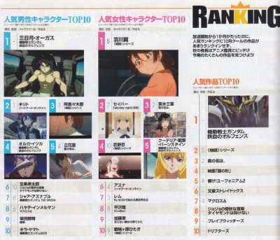 Недавно вышел новый номер журнала Newtype, где опубликован новый рейтинг персонажей. И хотя персонажи "Kizumonogatari", "Sword Art Online", "Your Name" и всё ещё входят в топ, их потеснил вернувшийся "Mobile Suit Gundam Iron Blooded Orphans".
